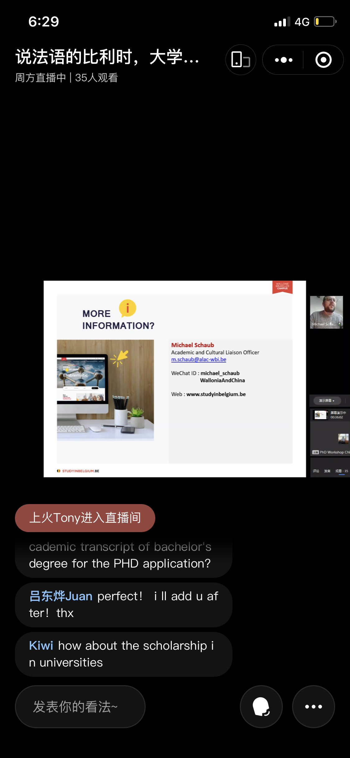 Cette année, à défaut de pouvoir organiser ce rendez-vous, les organisateurs ont proposé aux participants habituels du PhD Workshop la tenue de webinaires. Comme certains établissements de Belgique francophone y sont présents chaque années grâce au soutien de Wallonie-Bruxelles International - Wallonie-Bruxelles Campus, l'Agent de liaison académique et culturelle (ALAC) en Chine les a représenté lors du webinaire. Lors de cet événement en ligne qui avait lieu le 8 décembre 2020, l'ALAC a présenté nos établissements d'enseignement supérieur à une soixantaine d'étudiants qui ont ensuite posé de nombreuses questions ; des échanges se poursuivent actuellement et permettront sûrement à des étudiants chinois de postuler à des programmes doctoraux en Wallonie et à Bruxelles !